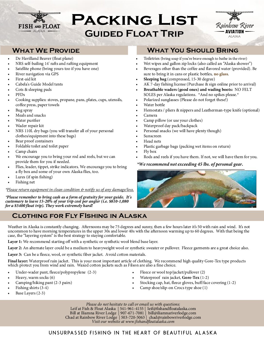 The supplies above should be sufficient fly fishing gear for Alaska. If you have any questions about what to bring on the trip, please contact us.